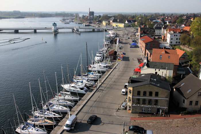 | 22.04.2011 - 9:11 Uhr - Kappeln/Schlei: Hafen und Stadt Ansichten von oben - aus dem Pierspeicher Südseite Hafen - Innenstadt Foto: Eckhard Schmidt - Kappeln - (C) 2011 |