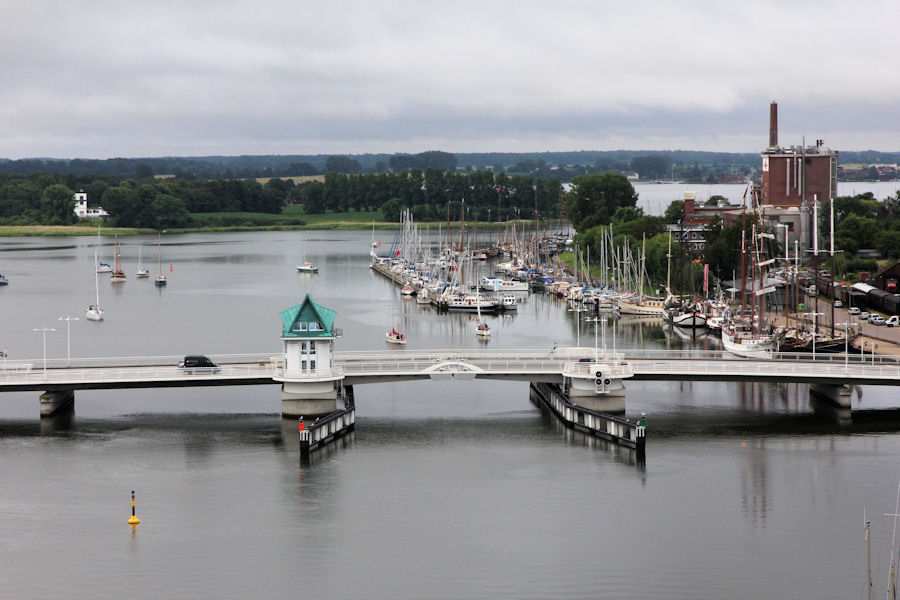 | 15.07.2011 - 8:44 Uhr - Kappeln/Schlei: PK-Speicher im Nordhafen 10. Obergeschoss - Südseite - Aussicht ASC-Yachthafen - Cremilk-Werk Südhafen Schleibrücke Südlich der Brücke warten Boote auf die Brückenöffnung 8:45 Uhr. Foto: Eckhard Schmidt - Kappeln - (C) 2011 |