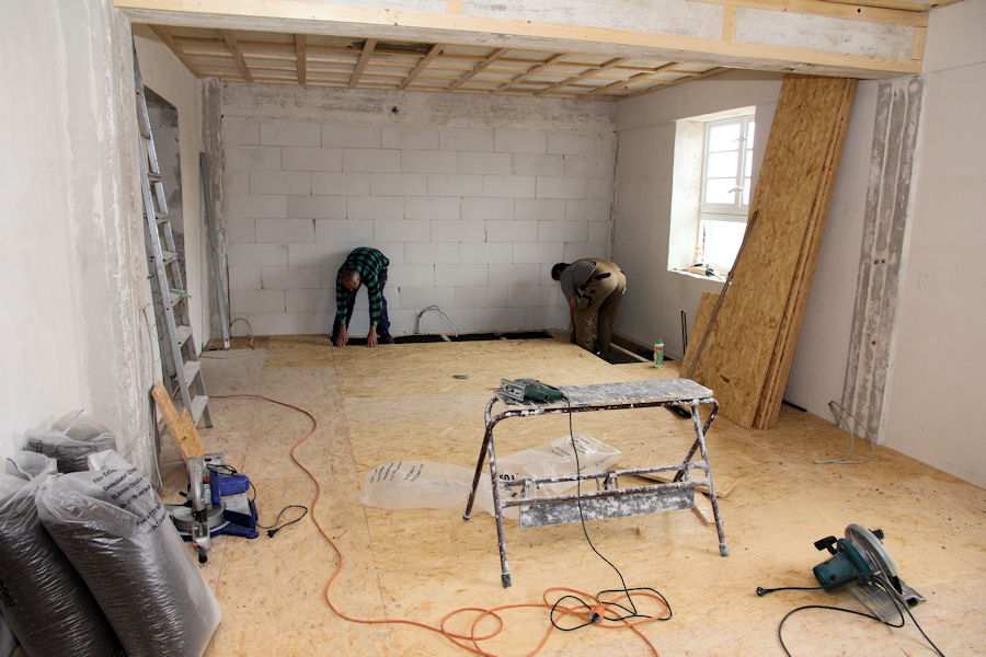 | 15.07.2011 - 8:56 Uhr - Kappeln/Schlei: PK-Speicher im Nordhafen 4. Obergeschoss - Südseite - Zimmer 10 Werner Heide und Manfred Möller sind dabei Spanplatten für den Fußboden zu verlegen. Foto: Eckhard Schmidt - Kappeln - (C) 2011 |