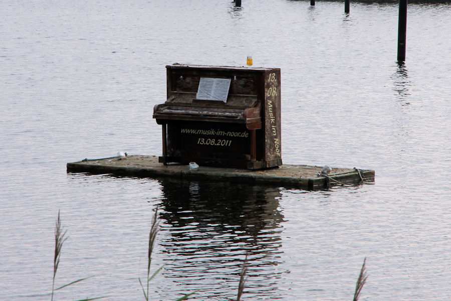 | 31.07.2011 - 8:17 Uhr - Arnis/Schlei Vom Aar bis zur Schifferkirche Ortseingang - Neuer Damm Arnisser Noor mit einem schwimmenden Klavier (rechts) Foto: Eckhard Schmidt - Kappeln - (C) 2011 |