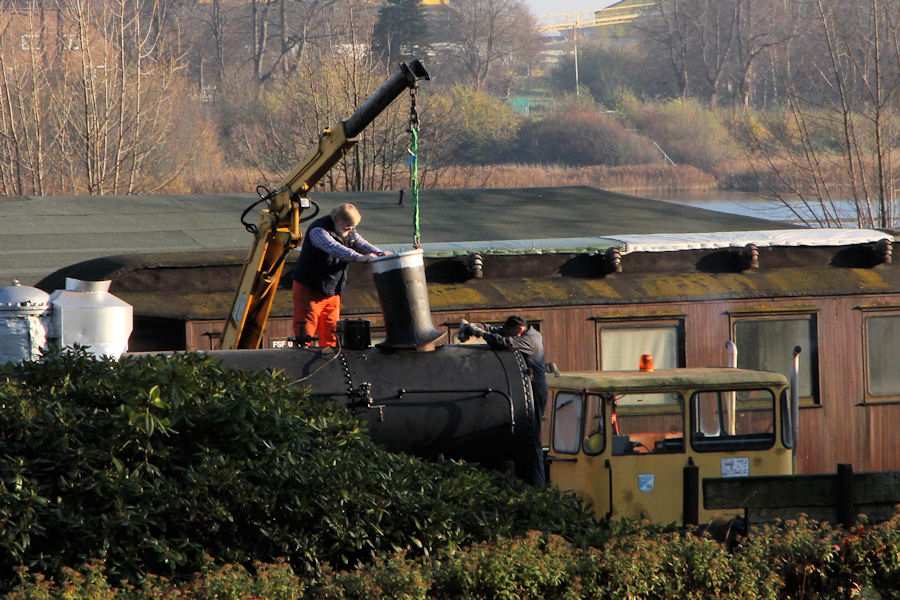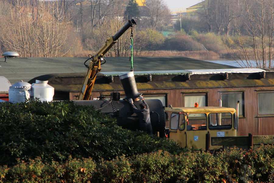 | 21.11.2011 - 12:56 Uhr - Kappeln/Schlei: Angelner Dampfeisenbahn Dampflok S1916 - Kesselreparatur - Einbau Schornstein Ich verfolge den Einbau des Schornsteines von meiner Terrasse aus. Foto: Eckhard Schmidt - Kappeln - (C) 2011 |