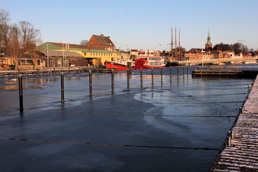 | 09.02.2012 - 9:06 Uhr - Kappeln/Schlei: Winter Februar 2012 Eis- und Schneelage im Bereich des Hafens Schleibrücke - Nordseite Blick in Richtung Nordhafen Foto: Eckhard Schmidt - Kappeln - (C) 2012 |