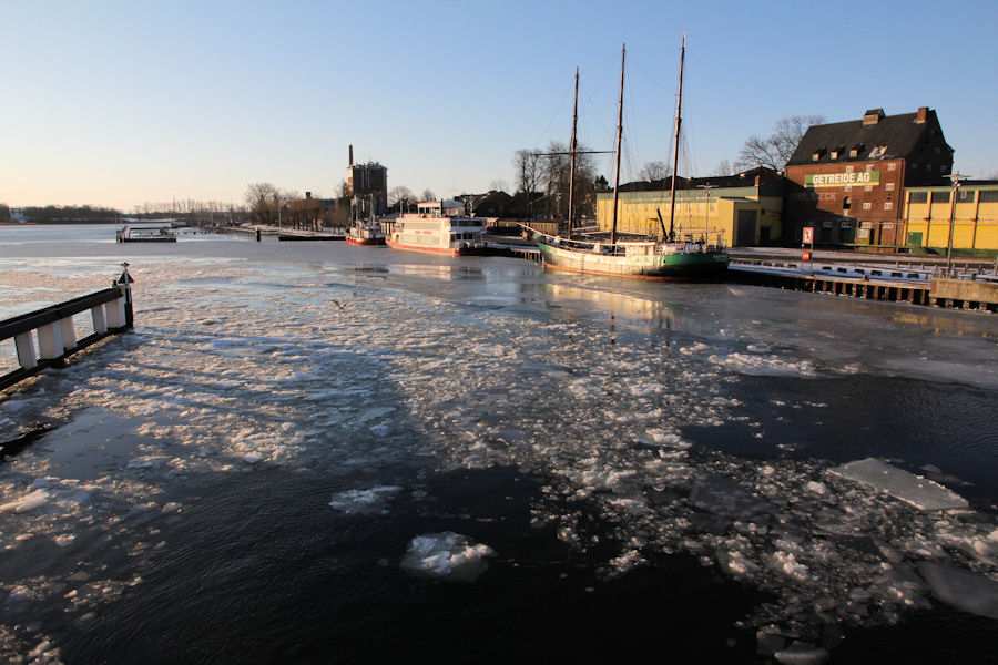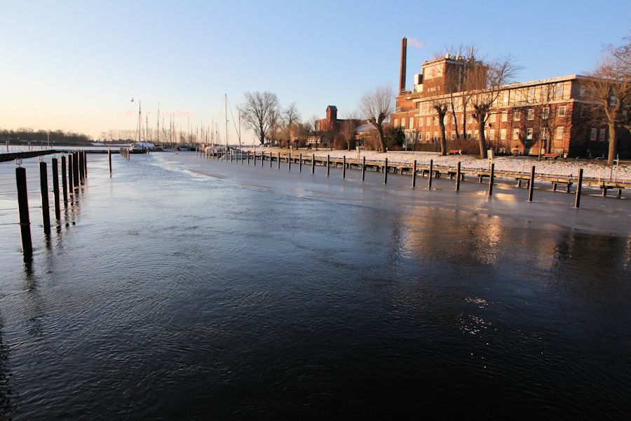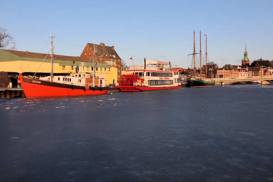 | 09.02.2012 - 9:00 Uhr - Kappeln/Schlei: Winter Februar 2012 Eis- und Schneelage im Bereich des Hafens Schleibrücke - Nordseite Blick in Richtung PK-Speicher Foto: Eckhard Schmidt - Kappeln - (C) 2012 |