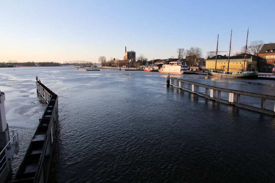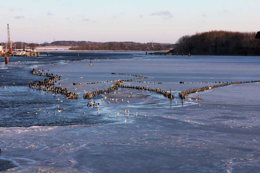 | 09.02.2012 - 9:03 Uhr - Kappeln/Schlei: Winter Februar 2012 Eis- und Schneelage im Bereich des Hafens Schleibrücke - Südseite Blick in Richtung Südhafen Foto: Eckhard Schmidt - Kappeln - (C) 2012 |