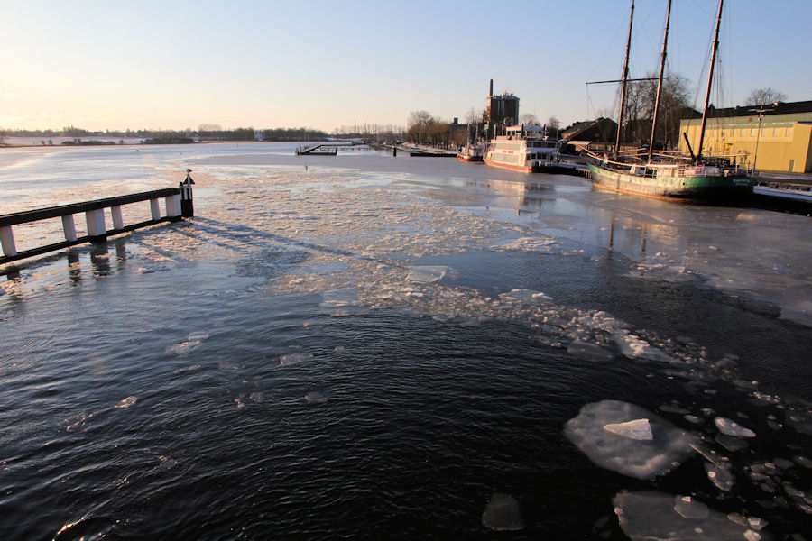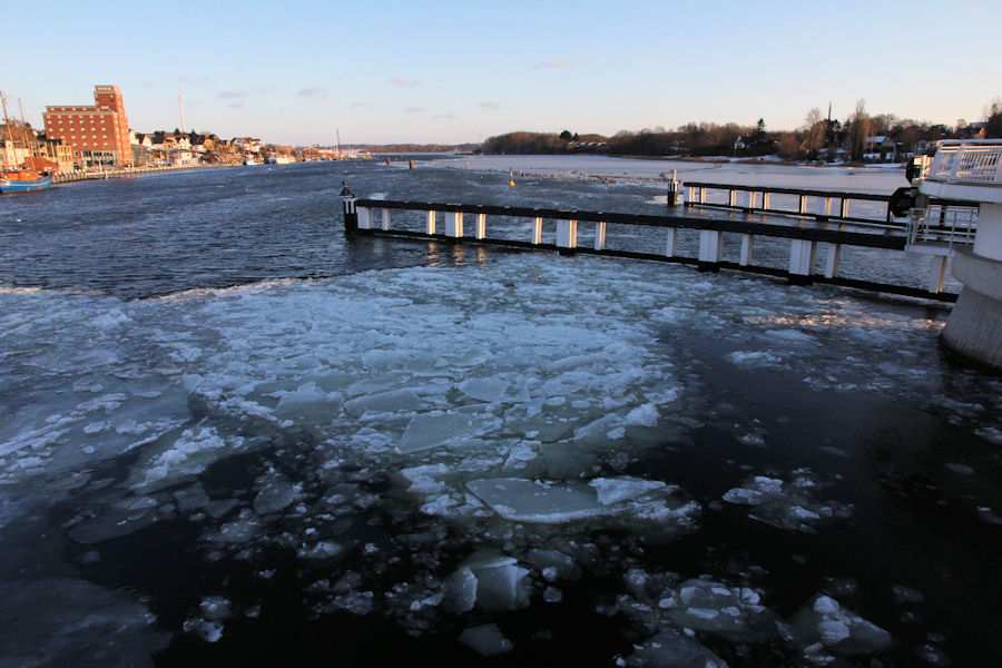 | 09.02.2012 - 9:04 Uhr - Kappeln/Schlei: Winter Februar 2012 Eis- und Schneelage im Bereich des Hafens Schleibrücke - Nordseite Die Eisschollen treiben in Richtung Süden. Foto: Eckhard Schmidt - Kappeln - (C) 2012 |
