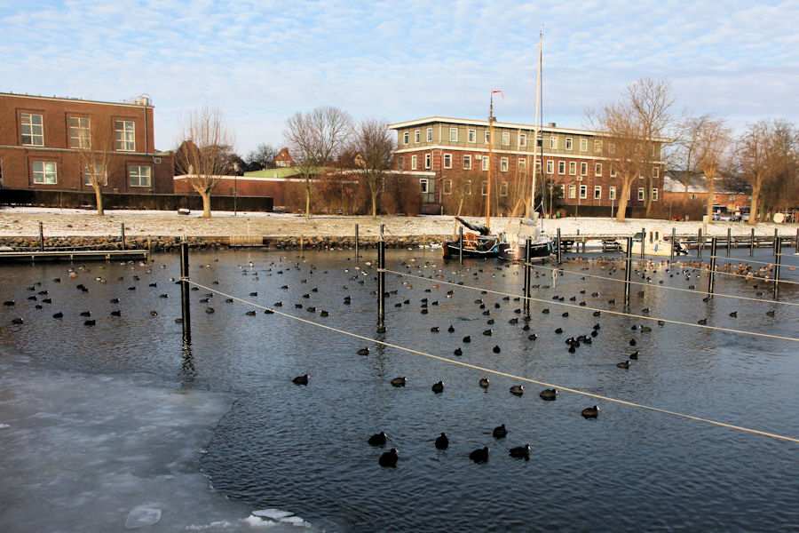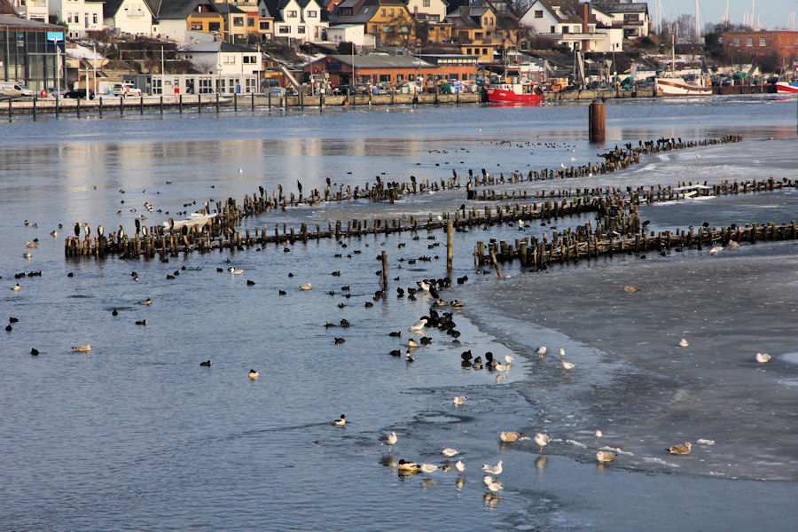 | 13.02.2012 - 9:05 Uhr - Kappeln/Schlei: Winter Februar 2012 Eis- und Schneelage im Bereich des Hafens ASC-Yachthafen Offene Wasserstelle mit Wasservögel Foto: Eckhard Schmidt - Kappeln - (C) 2012 |