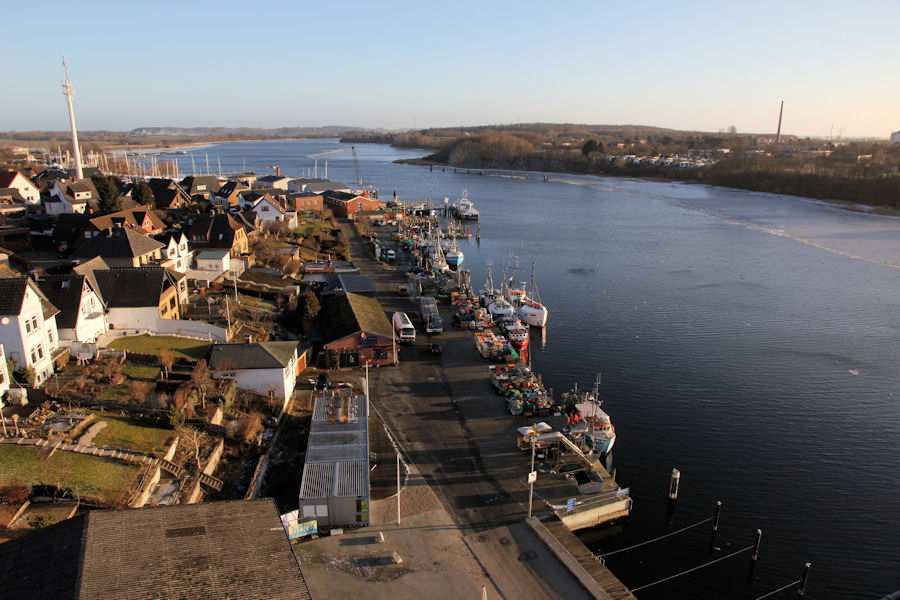 | 15.02.2012 - 8:47 Uhr - Kappeln/Schlei: PK-Speicher im Nordhafen 10. Obergeschoss - Nordseite - Aussicht Fischereihafen Foto: Eckhard Schmidt - Kappeln - (C) 2012 |