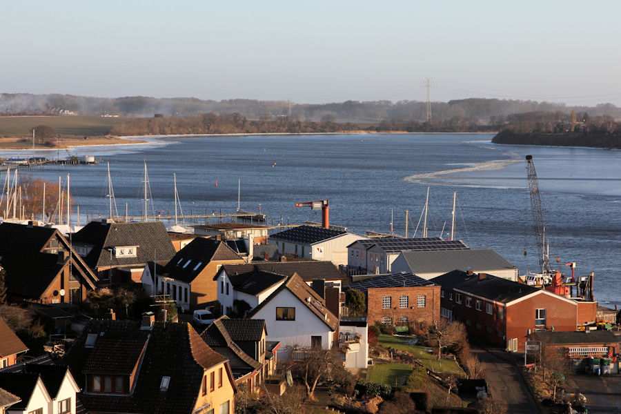 | 15.02.2012 - 8:45 Uhr - Kappeln/Schlei: PK-Speicher im Nordhafen 10. Obergeschoss - Südseite - Aussicht ASC-Yachthafen - Cremilk-Werk Südhafen Schleibrücke Foto: Eckhard Schmidt - Kappeln - (C) 2012 |