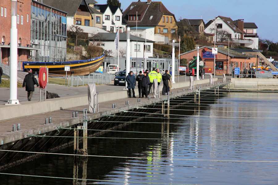 | 23.02.2012 - 11:26 Uhr - Kappeln/Schlei: Hafen Polizeitaucher aus Eutin machen Reinschiff auf dem Hafengrund Gastliegerhafen - Kaiabschnitt 3 Die Kollegen der Taucher begleiten diese oben auf dem Steg. Foto: Eckhard Schmidt - Kappeln - (C) 2012 |
