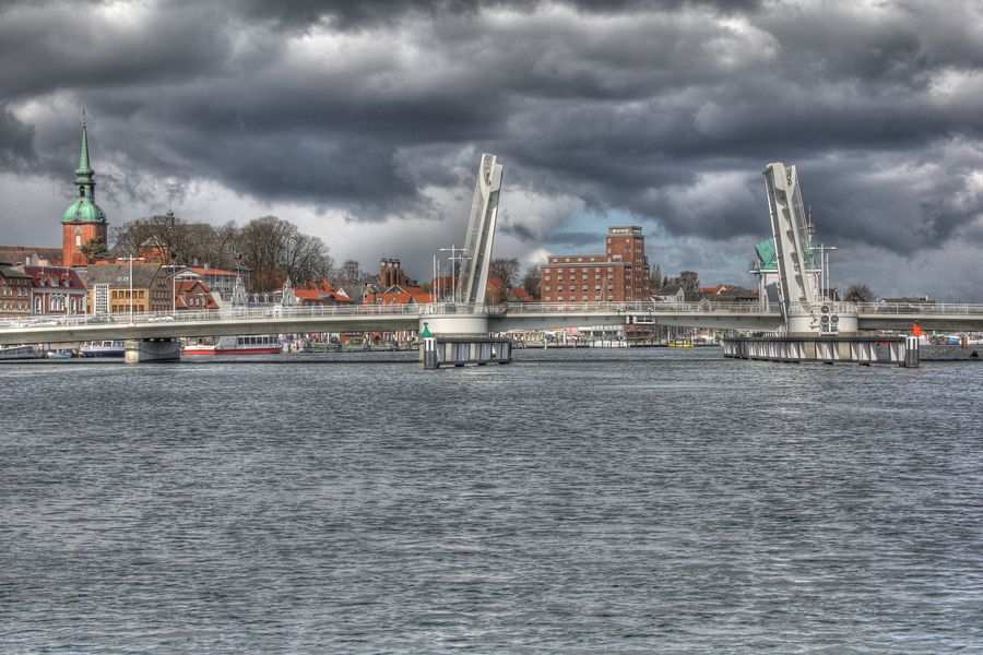 HDR-Bild 5/6 Schleibrücke in Kappeln Nördliches Klappenpaar C/D in der Stellung Verkehrslage Südliches Klappenpaar A/B in der Stellung Hochlage Tone Mapping: Compressor-Standard |