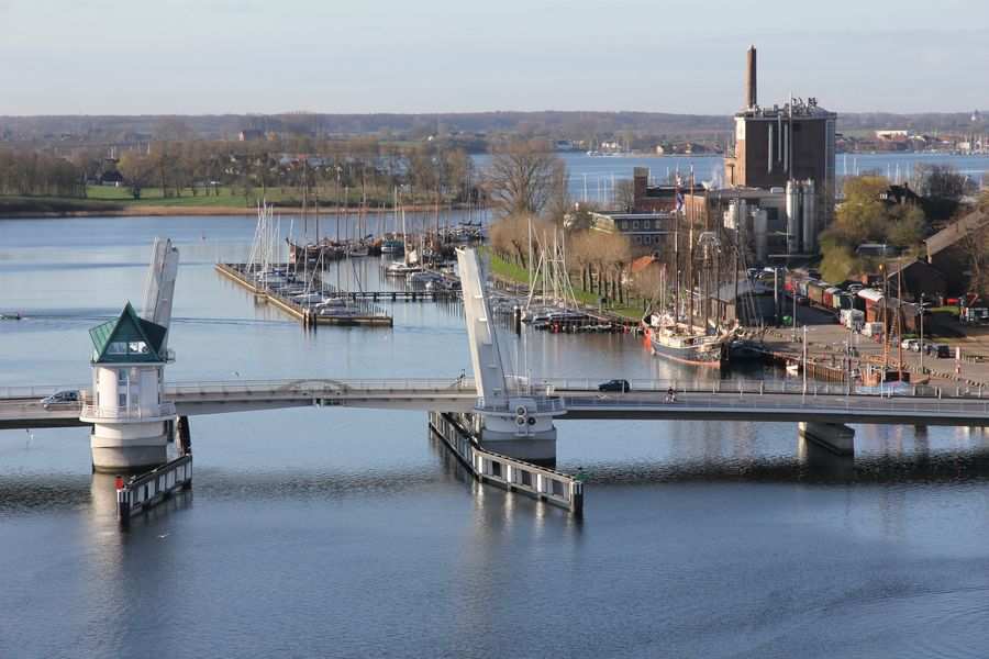 Bild 6/6 ASC-Yachthafen - Cremilk-Werk Südhafen Im Südhafen haben die beiden Traditionssegler HENDRIKA BARTELDS und NEERLANDIA festgemacht. Schleibrücke - Nördliches Klappenpaar in der Stellung Hochlage Der Verkehr wird jetzt komplett über das südliche Klappenpaar A/B geleitet. |