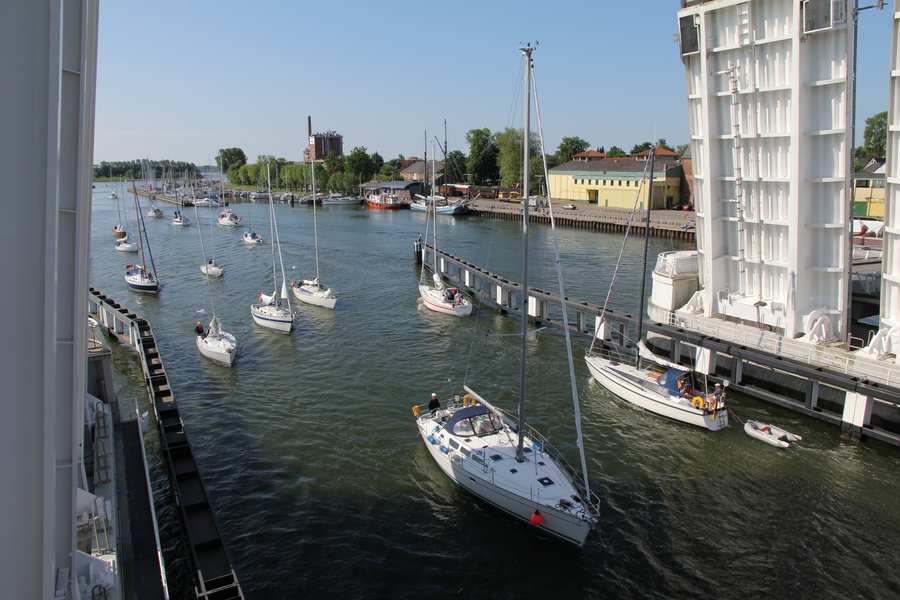 9:45:45 Uhr Bild 10/36 Auf der Nordseite warten nicht so viele Boote auf die Öffnung der Brücke. |