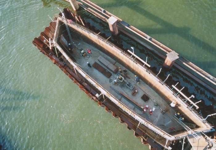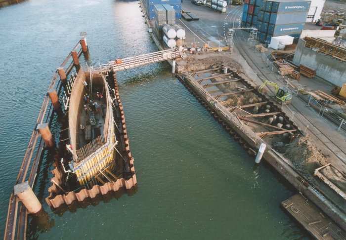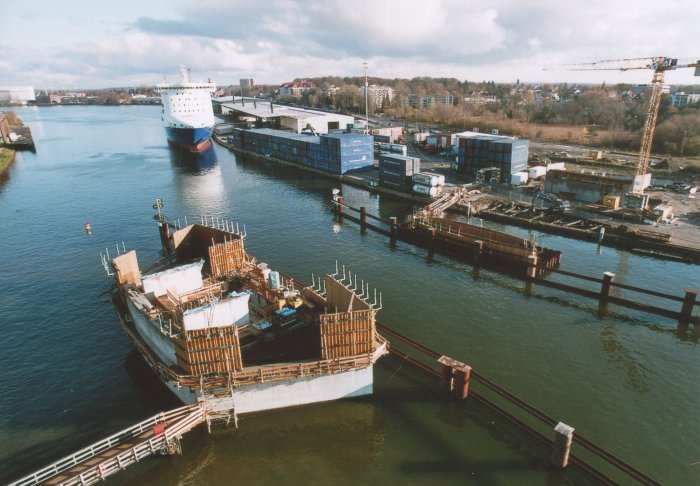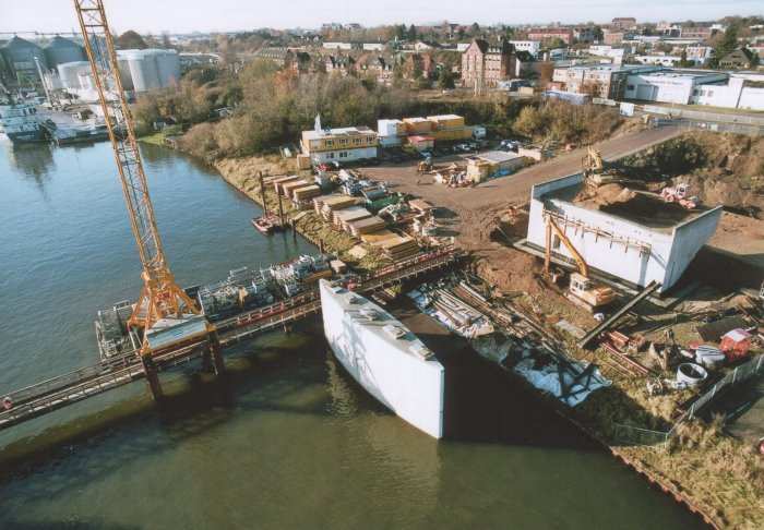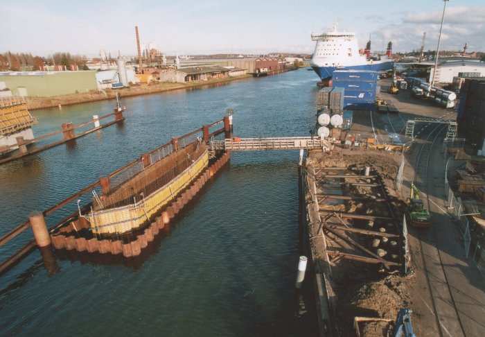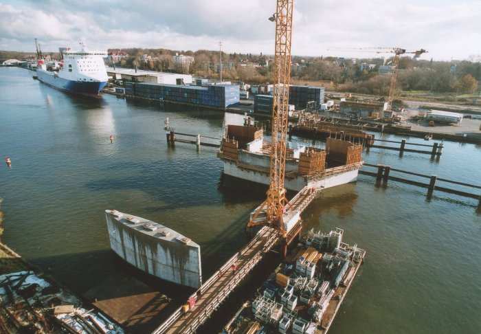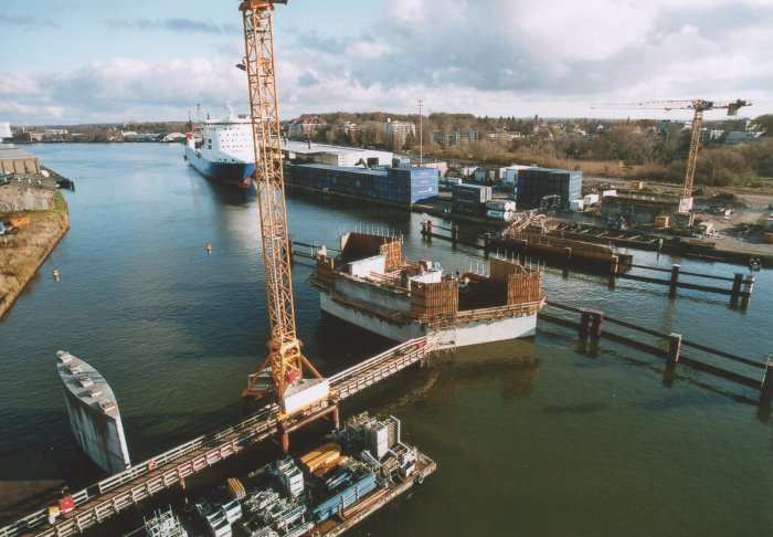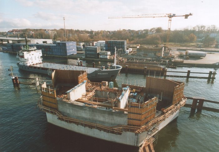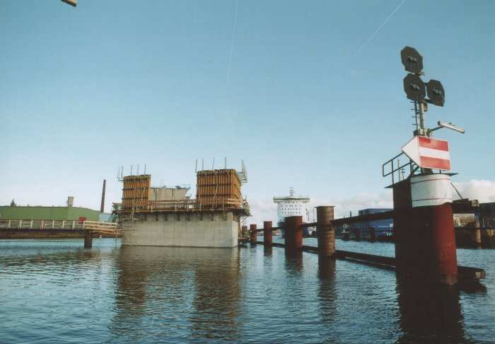| 21.11.2005 - Lübeck: Bau einer Traveklappbrücke im Zuge der Nordtangente Blick auf den Pfeiler 2 (P2). Hier wird noch eingeschalt. Der Frachter MINCHEN D" passiert die Baustelle in Richtung Innenstadt (Süden). Foto: Einar Maschmann - Kappeln |