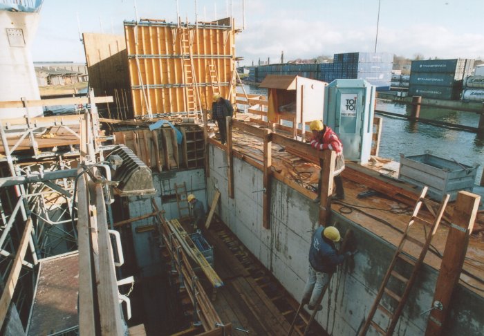 | 21.11.2005 - Lübeck: Bau einer Traveklappbrücke im Zuge der Nordtangente Die nördliche Seitenwand des Pfeilers 2 (P2). Hier wird noch wie auf der südlichen Seitenwand eingeschalt. Foto: Einar Maschmann - Kappeln |