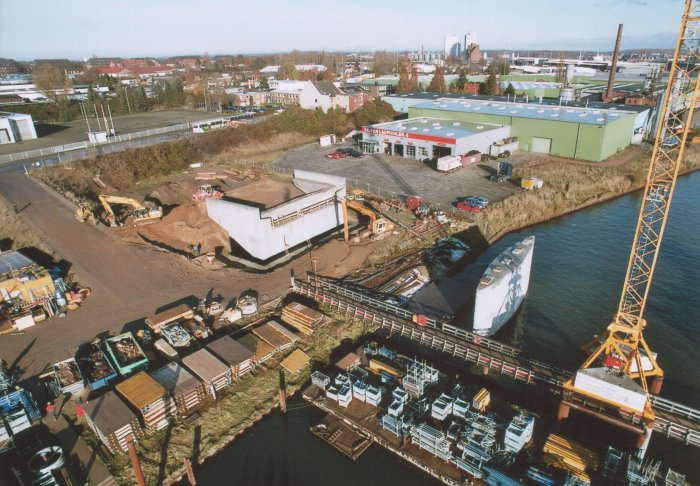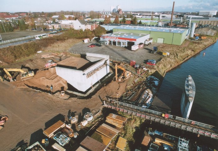 | 21.11.2005 - Lübeck: Bau einer Traveklappbrücke im Zuge der Nordtangente Blick auf das westliche Traveufer. Von links nach rechts: - der westliche Turmdrehkran - der Pfeiler 1 (P1) - das Widerlager West (WW) Foto: Einar Maschmann - Kappeln |