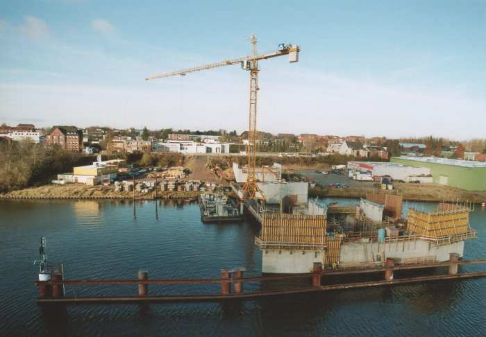 | 21.11.2005 - Lübeck: Bau einer Traveklappbrücke im Zuge der Nordtangente Blick auf den westlichen Baustellenbereich. Von links nach rechts: - das Widerlager West (WW) - der Pfeiler 1 (P1) - der westliche Turmdrehkran - der Pfeiler 2 (P2) = Klappenpfeiler - das Brückenleitwerk Foto: Einar Maschmann - Kappeln |