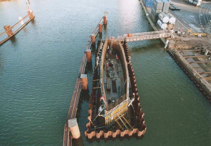 | 21.11.2005 - Lübeck: Bau einer Traveklappbrücke im Zuge der Nordtangente Blick von Norden in das Innere des Pfeilers 3 (P3). Links im Bild das östliche Ufer der Trave. Rechts im Bild das Brückenleitwerk. Foto: Einar Maschmann - Kappeln |