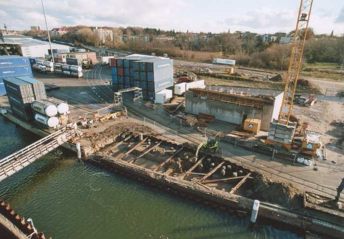 | 21.11.2005 - Lübeck: Bau einer Traveklappbrücke im Zuge der Nordtangente Blick auf das westliche Traveufer. Links: das Widerlager West (WW). Rechts: der Pfeiler 1 (P1). Foto: Einar Maschmann - Kappeln |