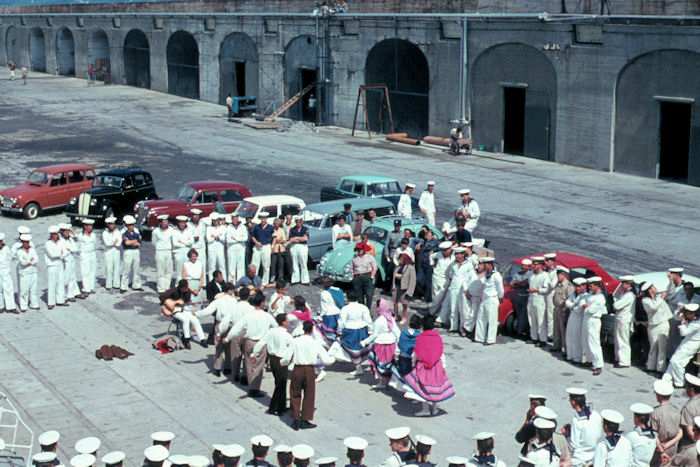 | 1967 - Zerstörer 3 (Z3) - D172 Ponta Delgada (Azoren - Insel: Sao Miguel) Eine Volkstanzgruppe der Insel zeigt uns ihr Können auf der Hafenmole. Foto (Dia): Eckhard Schmidt - Kappeln (1967) |