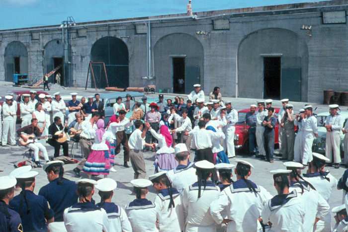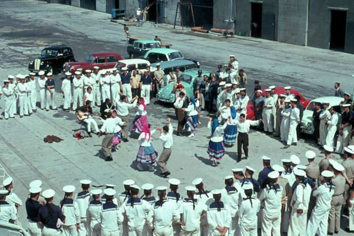| 1967 - Zerstörer 3 (Z3) - D172 Ponta Delgada (Azoren - Insel: Sao Miguel) Unser Aufenthalt in Ponta Delgada ist fast beendet. Eine Volkstanzgruppe der Insel zeigt uns ihr Können auf der Hafenmole. Foto (Dia): Eckhard Schmidt - Kappeln (1967) |