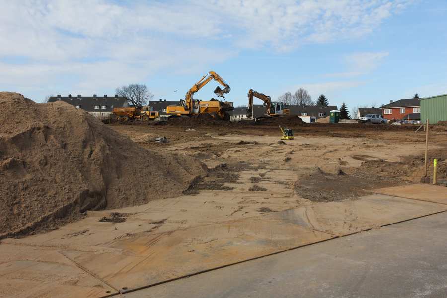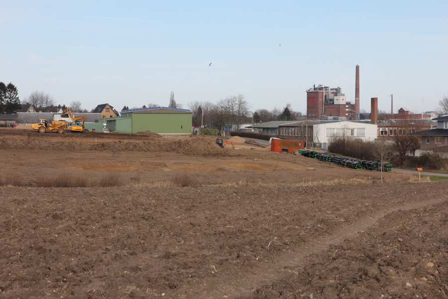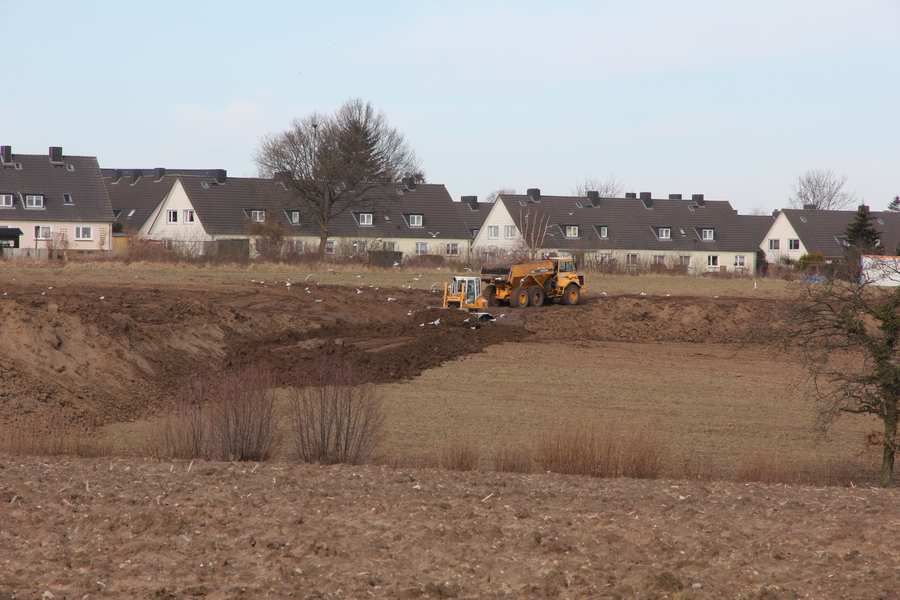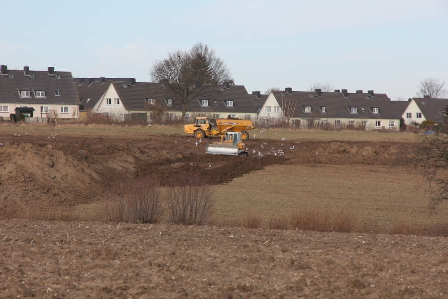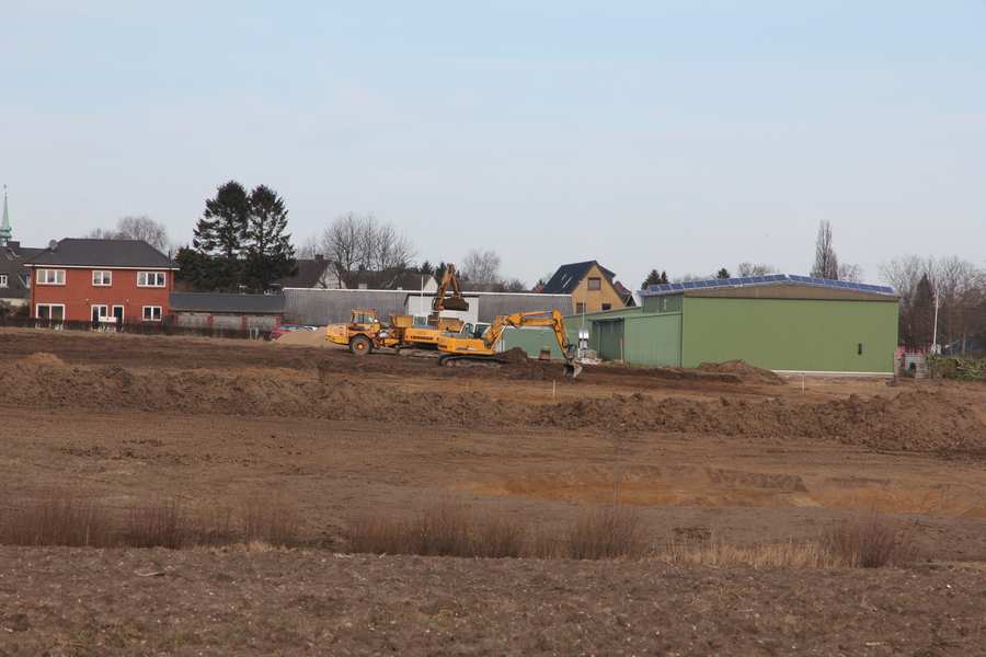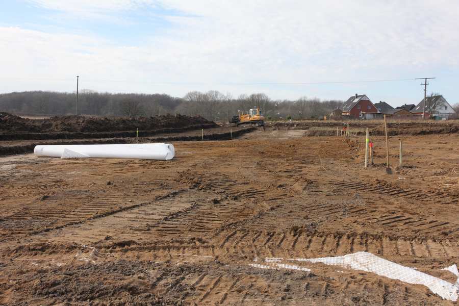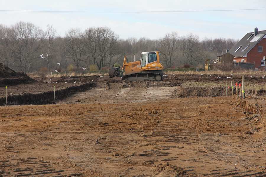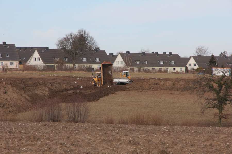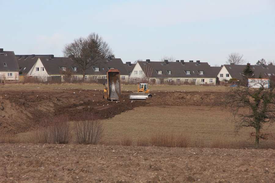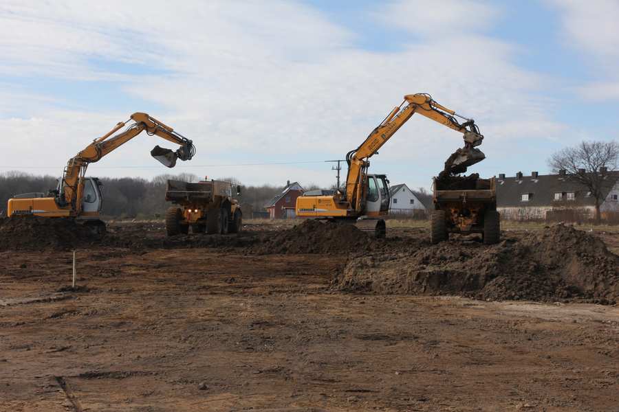 Ansicht von der Arnisser Straße Raupenbagger und Dumper -------------------------------- Die Tiefbauarbeiten werden von der Tiefbaufirma Brückner aus Kappeln-Mehlbydiek ausgeführt. Es kommen Raupenbagger und Dumper zum Einsatz, um die Erde bewegen zu können. Ferner ist noch eine Planierraupe im Einsatz, um die Erde verteilen zu können. |
