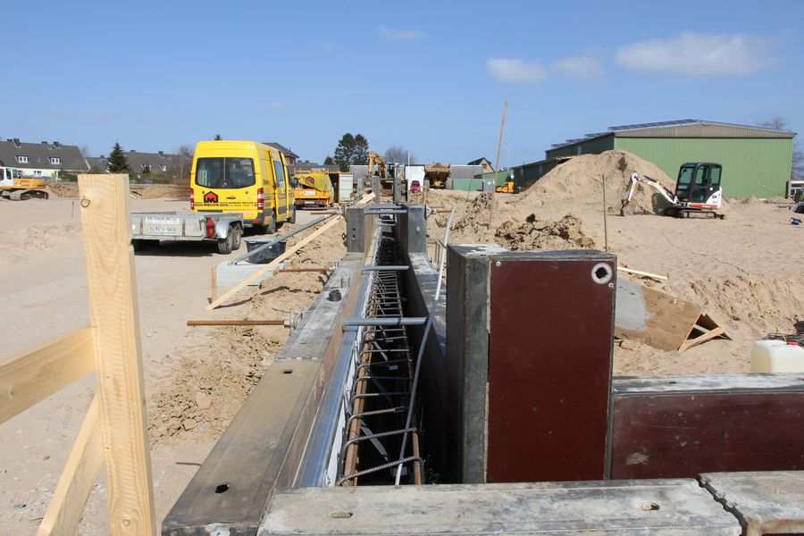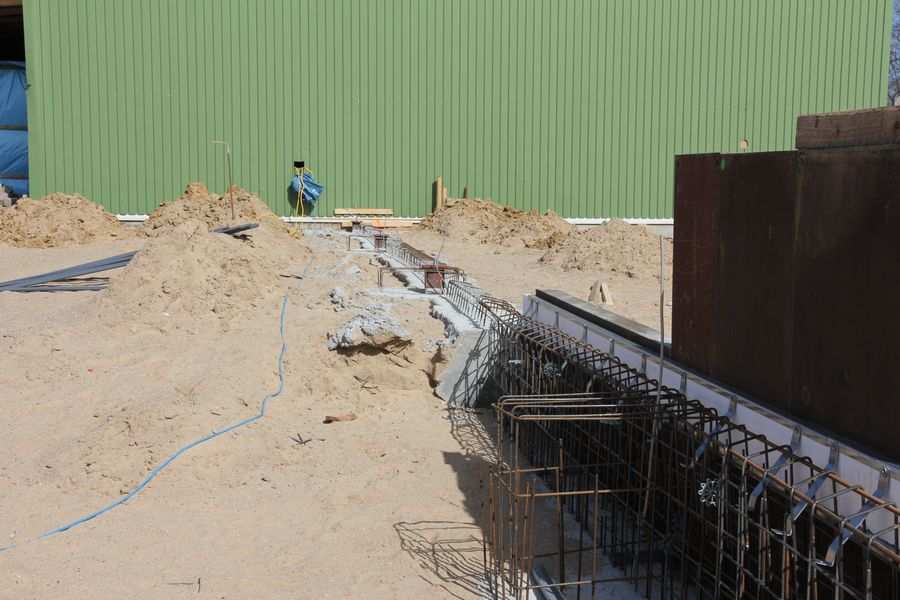 Bild 9/21 Baugelände der Werkhalle Ostseite Im nördlichen Bereich des Geländes hat das Fundament die gleiche Höhe wie die zukünftige Betonmauer (rechts). |