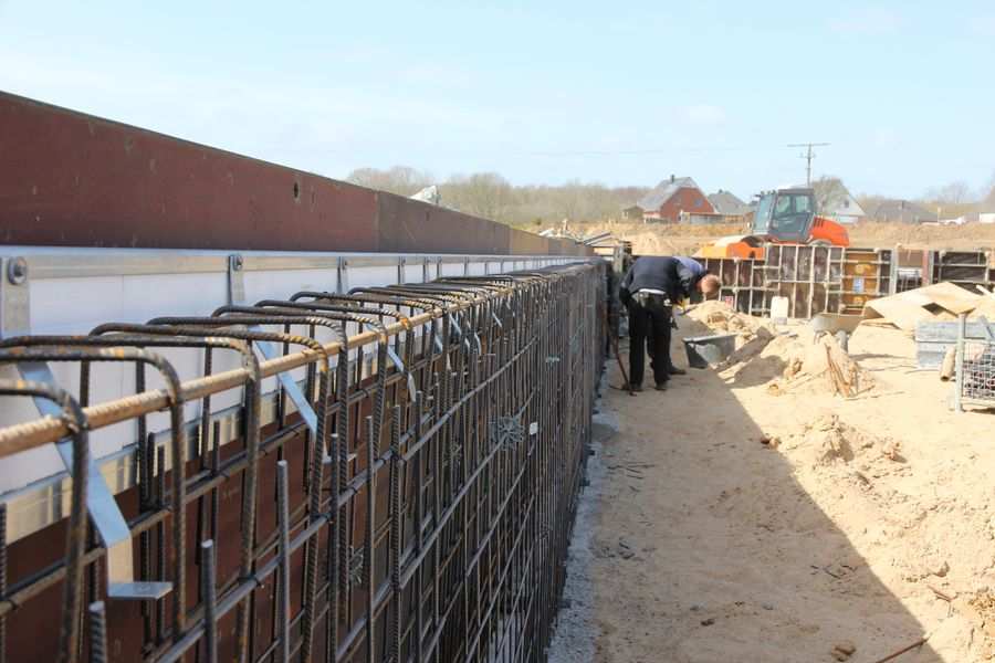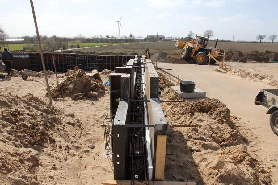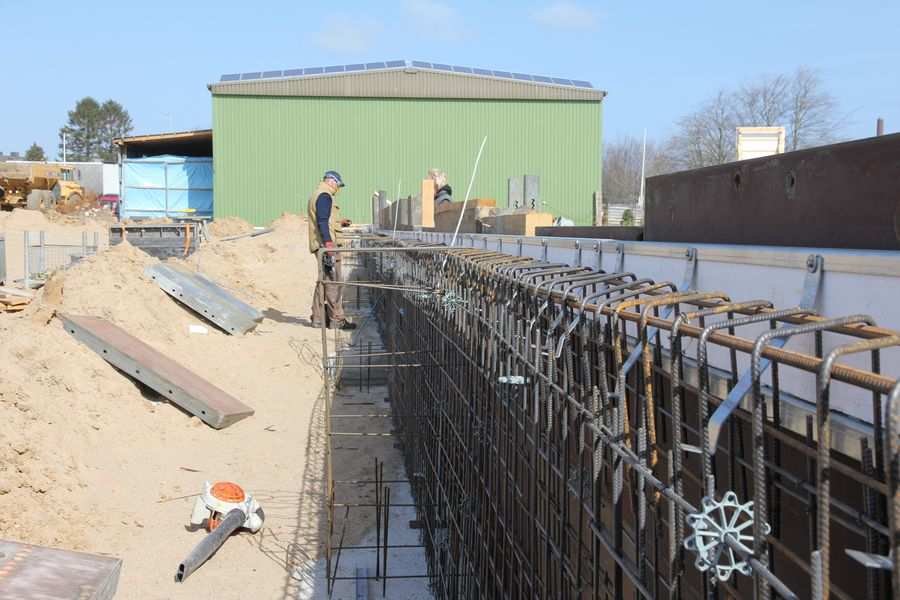 Bild 4/21 Baugelände der Werkhalle Südseite Es wird gerade die innere Schalungswand aufgestellt. Zwischen der inneren und äußeren Schalungswand ist die Bewehrung zu erkennen. |