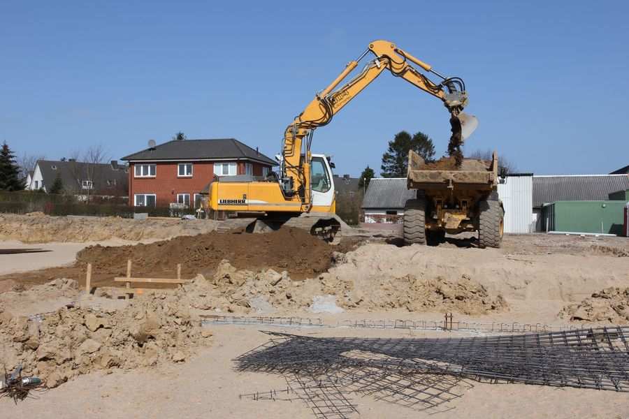 Bild 21/21 Baugelände Südseite Mit Hilfe eines Raupenbaggers wird das Beton-Recycling-Material auf der Baustraße West verteilt. |