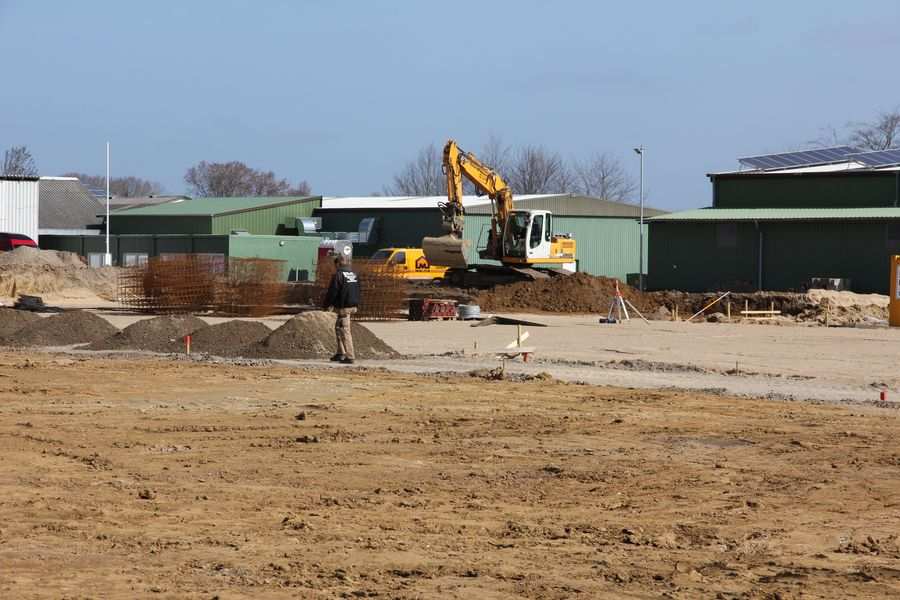 Bild 2/3 Gelände westlich der Lagerhalle - Baustraße West - Baugelände Lagerhalle - Baustraße Mitte Westlich der Lagerhalle (links) wird gerade Boden abgetragen. Heute weht ein kräftiger Wind aus westlicher Richtung. |