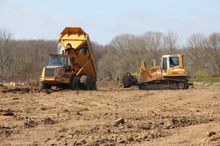 Bild 3/3 Gelände westlich der Lagerhalle Ein Dumper transportiert abgetragenen Boden zum Ablageort, damit die Planierraupe diesen verteilen kann. |