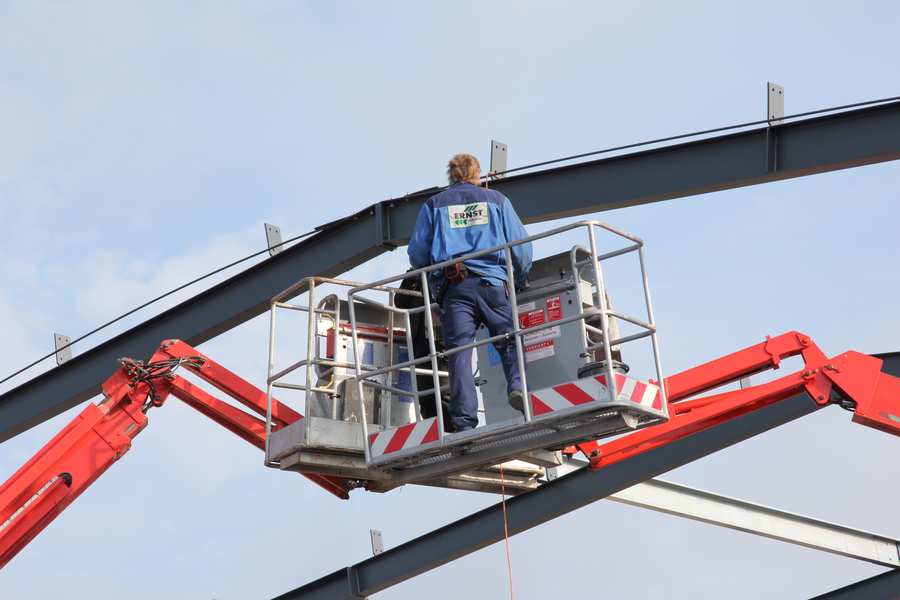 Bild 15/30 Lagerhalle Ansicht von Nordwesten Es werden gerade die Querträger zwischen zwei Stützen montiert. |