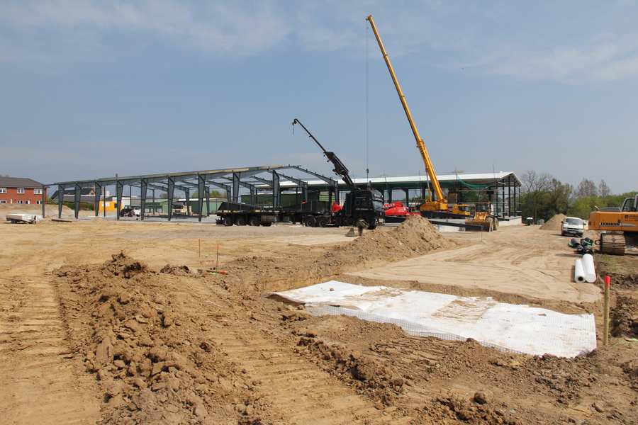13:05 Uhr Bild 22/30 Lager- und Werkhalle Ansicht vom Acker westlich der Arnisser Straße Es werden gerade die Stahlbauteile der Lagerhalle aufgestellt. |