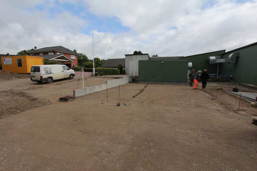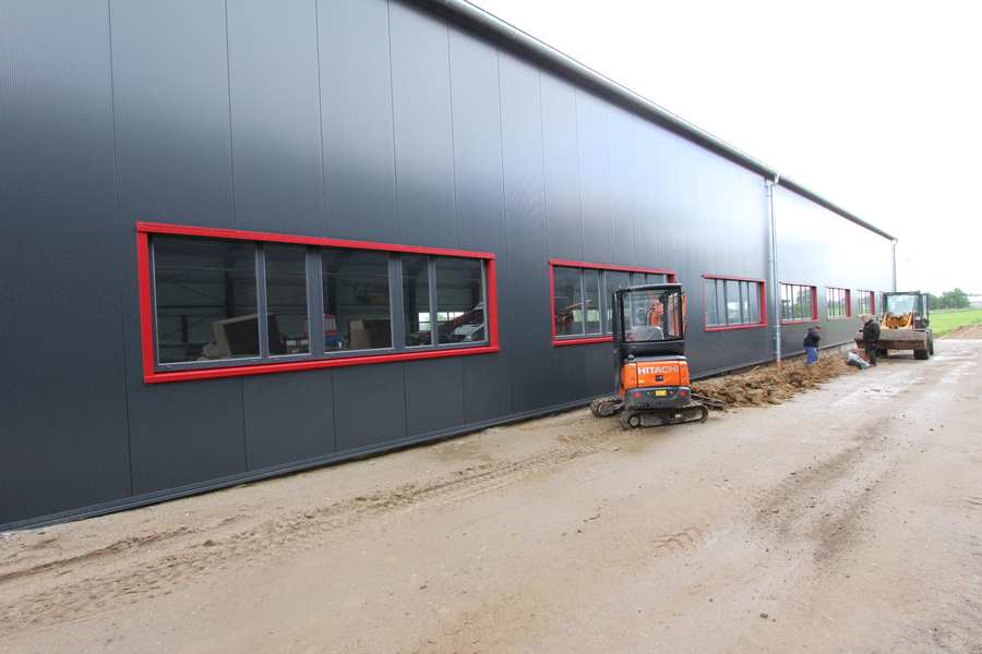 Bild 17/24 Werkhalle Westseite Es wurden die roten Fensterbänke montiert. Rund um die Halle wird gerade eine Drainageleitung verlegt. |