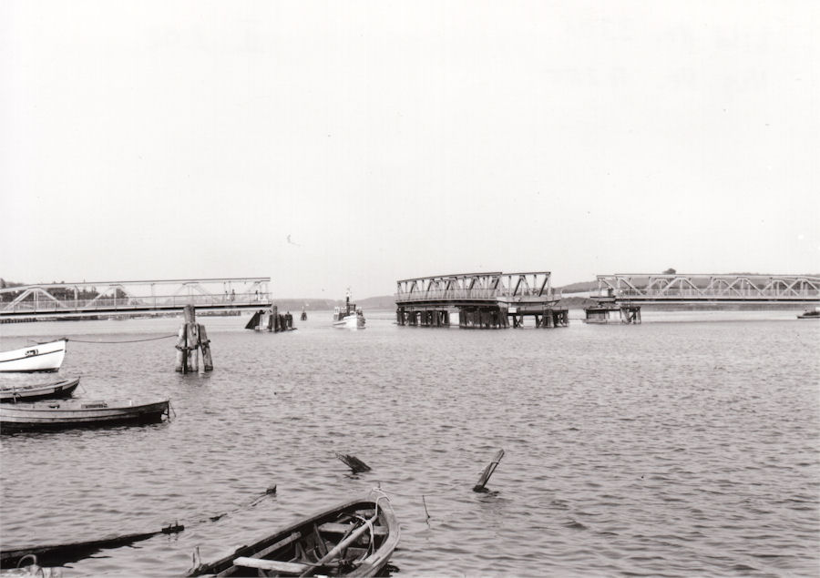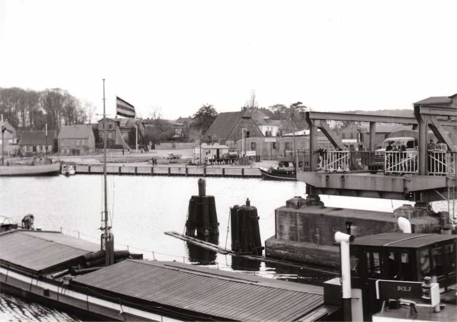 | 1954 - Drehbrücke in Kappeln an der Schlei Ein kleiner Frachter passiert gerade die Drehbrücke. Foto: Stadtarchiv Kappeln - Eckhard Schmidt - Kappeln/Schlei |