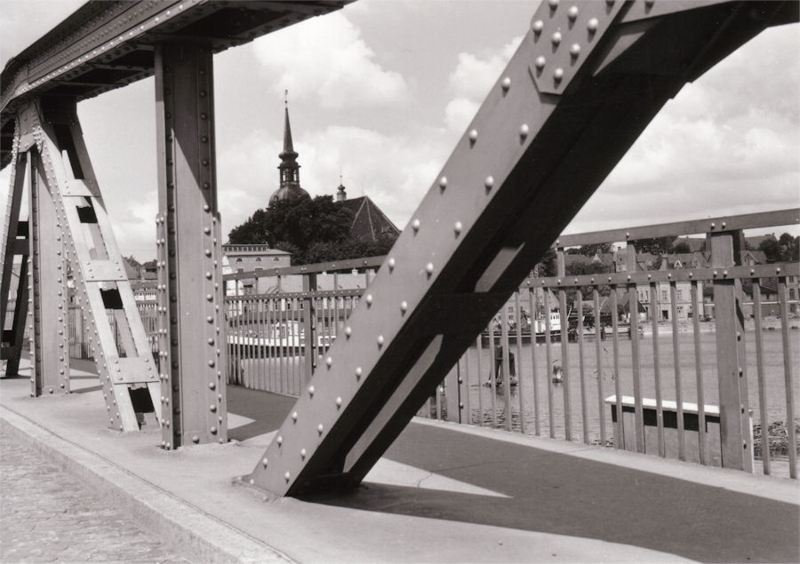 | 1954 - Drehbrücke in Kappeln an der Schlei Blick vom Überbau 4 auf die Nikolai-Kirche. Damals machten die Fischkutter noch am Nordhafen direkt hinter der Brücke fest. Foto: Stadtarchiv Kappeln - Eckhard Schmidt - Kappeln/Schlei |