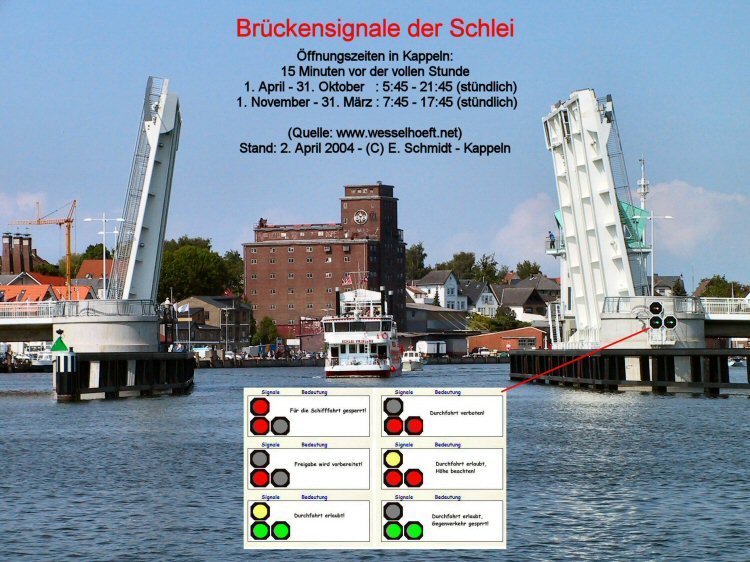 | Brückensignale der Schlei (siehe auch nächstes Bild) Öffnungszeiten der Klappbrücke in Kappeln: 15 Minuten vor der vollen Stunde 1. April - 31. Oktober: 5:45 - 21:45 (stündlich) 1. November - 31. März: 7:45 - 17:45 (stündlich) |